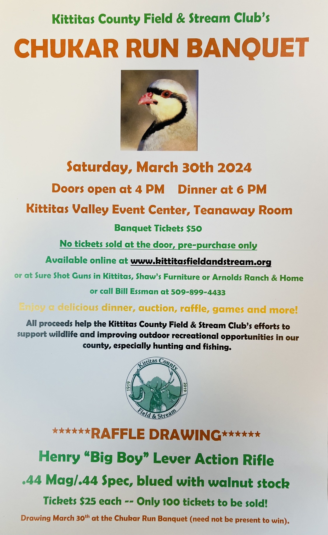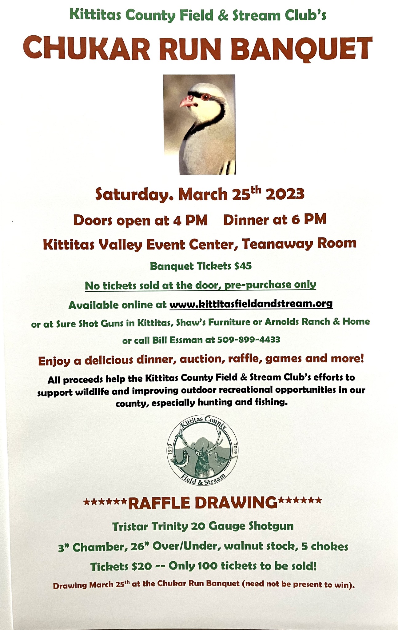 Before the Banquet, contact Bill Essman at 509-899-4433 to buy a ticket for our choice pick of one Rifle or one Shotgun for $20 per ticket. TICKET NUMBERS ARE LIMITED for this raffle — ONLY 100 tickets sold per firearm.